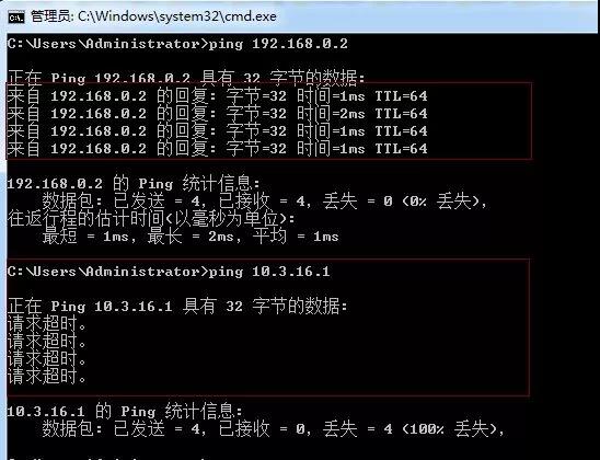 比如:ping 192.168.0.2就是通的,而ping不在同一個網段的10.3.16.1就不同,如下圖: