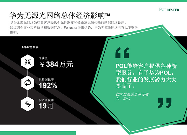 2022年上半年,華為委托權威咨詢公司Forrester進行了《華為無源光網(wǎng)絡總體經(jīng)濟影響™》研究。在本研究中,F(xiàn)orrester通過客戶訪談,以專有方法論分析部署華為無源光網(wǎng)絡(Passive optical LAN,POL)方案對企業(yè)帶來的經(jīng)濟影響。研究結(jié)果顯示,企業(yè)使用華為POL五年投資回報率達192%,投資回報周期為19個月。