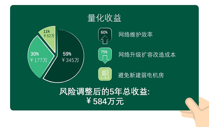擴容建設投資:網(wǎng)絡升級擴容基于POL簡架構(gòu)、光纖輕便靈活可以節(jié)約75%建設投資,五年總收益現(xiàn)值超177萬元人民幣。